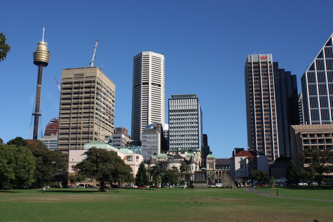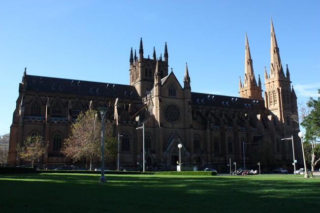 Heute wollen wir also Sydney unsicher machen. Das Wetter ist erfreulicherweise absolut perfekt. Es ist angenehm warm und der Himmel ist strahlend blau. Zu Fuß suchen wir uns den Weg vom Darling Harbour aus durch die Hochhäuserschluchten Richtung National Botanic Garden. Wir laufen zunächst durch den Hyde Park und vorbei an der St. Mary's Cathedral.