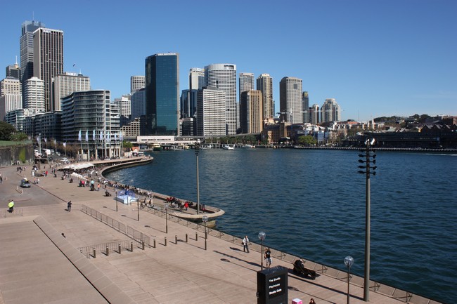 Entlang der Promenade passieren wir wieder einmal die Oper und werfen einen Blick auf die Skyline von Sydney. Wie man sieht, spielt heute erfreulicherweise wieder das Wetter perfekt mit. Der Himmel ist strahlend blau und es sind angenehme 20°C.