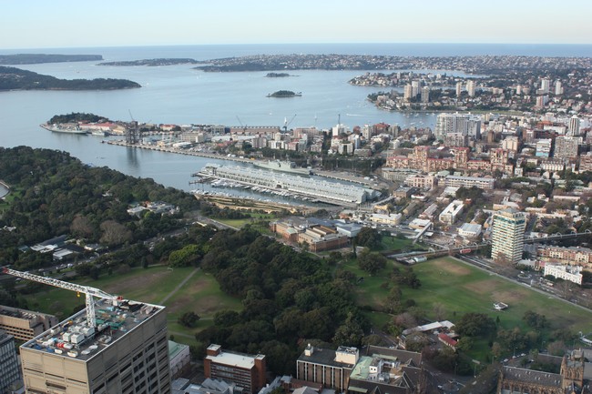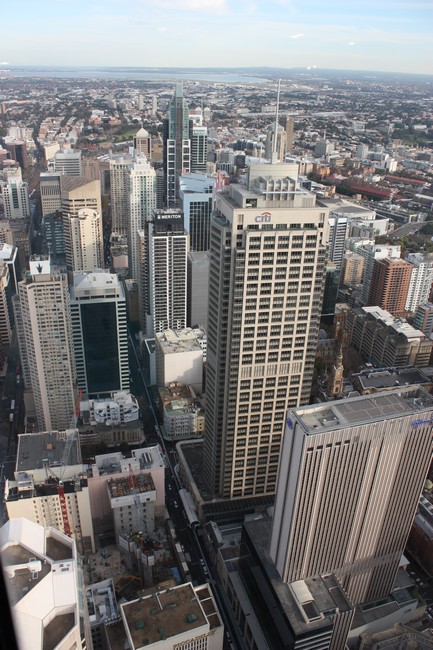 Zurück in der City gönnen wir uns erstmal als verspätetes Mittagessen Sandwichs aus einem 7 Eleven, die wir in einem kleinen Park futtern. Wir steuern dann den Sydney Tower an. Um hineinzukommen muss man zunächst durch ein Einkaufszentrum. Die Preise für den Aussichtsturm haben es ganz schön in sich - 50 AUD für zwei Personen - aber was soll’s, wir sind schließlich nur ein Mal hier. Oben angekommen bieten sich uns wunderbare Blicke über die Stadt. Man sieht die Hafenanlage, die kleinen Inseln und die Hochhäuserschluchten. Schade finde ich nur, dass die Hochhäuser die Sicht auf die Oper und die Harbour Bridge ziemlich verdecken.