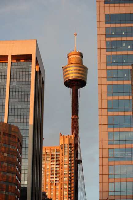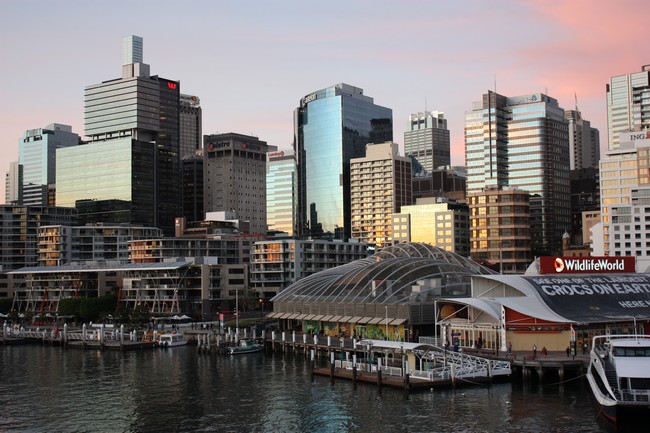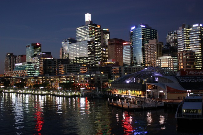 Mittlerweile wird auch schon langsam Abend und da wir morgen früh rausmüssen, machen wir uns auf den Rückweg zum Darling Harbour, diesmal laufen wir aber eine andere Strecke. Am Darling Harbour legen wir erneut einen Stopp ein und beobachten wie die Hochhäuser von der untergehenden Sonne angestrahlt werden. Wir trollen uns am Darling Harbour herum bis es dunkel ist.