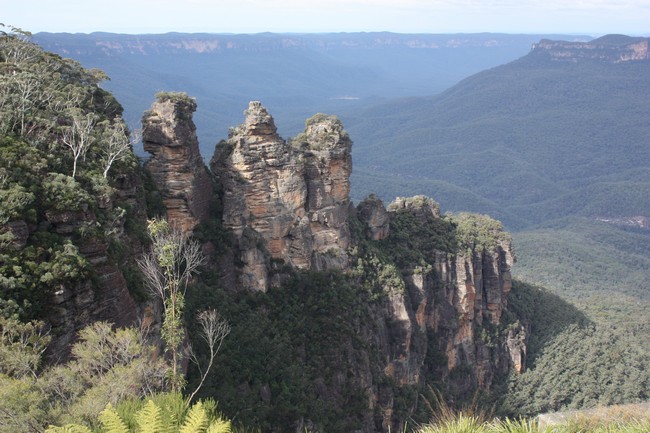 Endlich geht es weiter Richtung Blue Mountains. Die Fahrt ist weiter als ich dachte und da heute Samstag ist, ist es recht voll. Als erstes stoppen wir an dem wohl bekanntesten Markenzeichen der Blue Mountains, den Three Sisters. Man kann vom Echo Point Lookout direkt in die canyonartige und dicht bewachsene Schlucht hineinsehen. Die Aussicht ist beeindruckend.