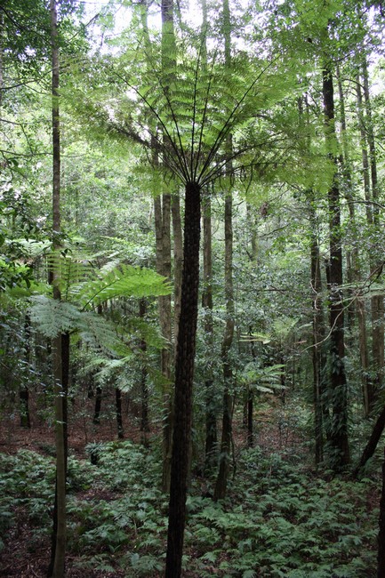 Auch hier gibt es meterhohe Farnbäume und auch sonst fühlt man sich wie direkt im Urwald. Man hat den Eindruck, dass sich der Wald am liebsten den vom Menschen freigelegten Weg wieder zurückholen wollen würde. Teilweise sind Löcher in die Planken geschnitten, damit die Bäume durchwachsen können und über den Broadwalk schlängeln sich überall Äste entlang.