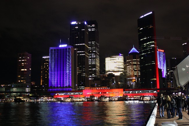Im Anschluss gehen wir auf direktem Wege zum Circular Quay. Je näher wir dem Kai kommen, desto voller wird es. Halb Sydney scheint auf den Beinen, kein Wunder, heute ist Samstag. Die Veranstaltung nennt sich Vivid Sydney Festival - Light, Music & Ideas - und wie der Name schon sagt, dreht sich alles um Licht und Farben. Schon von Weitem haben wir gesehen, dass etliche Hochhäuser bunt angestrahlt werden, auch die Straßenlaternen und teilweise sogar die Bäume sind farbig geschmuckt. Überall spielt Live Musik, größtenteils Aboriginies mit ihren Didgeridoos, aber auf eine ganz moderne Art und Weise. Es herrscht eine ganz tolle Stimmung.