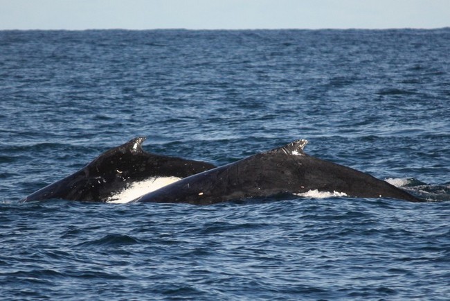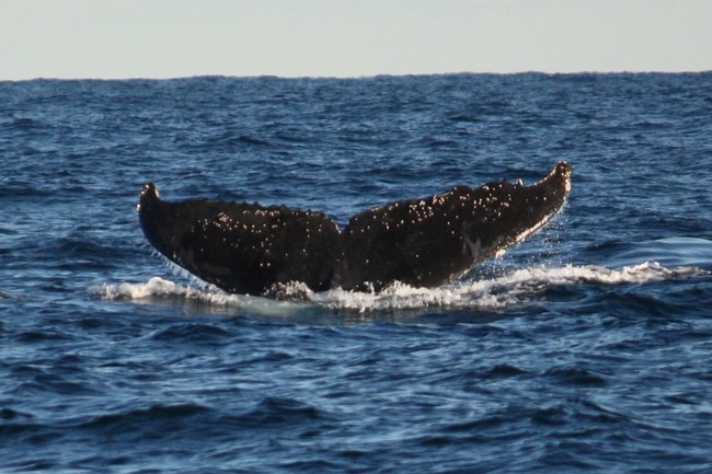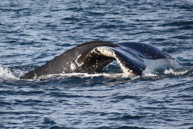 Es dauert nicht lange und wir entdecken die Wale. Es handelt sich um zwei Buckelwale, die teilweise wirklich nah ans Boot herankommen. Die beiden tauchen in regelmäßigen Abständen auf und strecken einige Male wie im Bilderbuch beim Abtauchen ihre mächtige Schwanzflosse in die Höhe. Sie sind dabei so nah, dass man sogar die Seepocken auf ihren Flossen entdecken kann. Einmal wuchtet einer der beiden Wale seine ganze hintere Körperhälfte übermütig aus dem Wasser. Sehr beeindruckend.