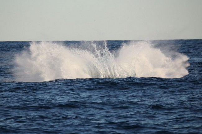 Nach einer gefühlten Ewigkeit des gebannten Wartens... tatsächlich - DA! - das tonnenschwere Tier springt nochmals in hohem Bogen nach oben, um sich anschließend rücklings wieder ins Wasser fallen zu lassen. Man kann dem Wal richtig in die Augen sehen. Ein atemberaubender Moment, wenn er auch nur Sekundenbuchteile angehalten hat. Alleine die wasserbombenartige Fontaine, die das Tier beim Zurückfallen in das Wasser auslöst, ist gigantisch.