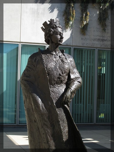 Das Gebäude kann besichtigt werden, nach einer kurzen Sicherheitskontrolle darf man fast nach Belieben frei darin herumspazieren. Da heute sowohl Senat und Repräsentantenhaus zusammen treffen, ist schon am 8:30 geöffnet. Wir besorgen uns an der Info eine Beschreibung und sehen uns die wichtigsten Punkte des Parlamentsgebäudes auf eigene Faust an. Das sind unter anderem eine ziemlich beeindruckende große Halle, eine Sammlung von Bildern aller bisherigen Premierminister von Australien (es ist interessant, dass man als Mitteleuropäer fast niemanden aus dieser Reihe kennt) sowie mehrere in Vitrinen ausgestellte Urkunden. Darunter die Gründungsurkunde von Australien, erstellt im Jahr 1900 und eine Petition, mit der sich eine Gruppe von Aborigines Ende der 60er Jahre des 20. Jahrhunderts erfolgreich gegen die Ausbeutung ihres Landes durch ein Bergbauunternahmen zur Wehr setzte. Einige große Plakate, die den Aufbau der australischen Demokratie detailliert erklären sind wahrscheinlich für Schulkinder gedacht, werden von uns aber dankbar und interessiert studiert. Im ersten Stockwerk gibt es eine schön angelegte Gartenterrasse, komplett mit Statue von Queen Elizabeth II. Diese Statue wurde sehr originalgetreu angefertigt: Wenn man genau hinschaut, kann man erkennen, dass sogar die Armbanduhr der Königin mit modelliert wurde.