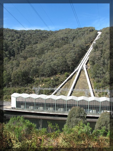 In Thredbo Village, einem mondänen Skiort fast direkt unterhalb des Mount Kosciuszko, ist noch Winterbetrieb: Es sind jede Menge Skifahrer und Snowboarder unterwegs, die in den Ort führenden Talabfahrten sind noch in Betrieb. Hinter Threadbo Village führt die Straße noch ein paar Kilometer bergauf, dann erreichen wir eine schön gelegene Passhöhe mit tollem Ausblick. Nach einer kurzen Pause geht es weiter, nun immer bergab an der Westseite des Gebirges. Hier ist der Pflanzenbewuchs wesentlich stärker als an der Ostseite - wir kurbeln unser Auto im dichten Wald um unzählige Haarnadelkurven. Am Kraftwerk Murray I machen wir kurzen Halt. Dieses Kraftwerk wurde 1967 im Rahmen des Snowy Mountains Hydro Electric Scheme eröffnet. Im Rahmen dieses Projekts wurden insgesamt sieben Wasserkraftwerke mit einer Gesamtleistung von knapp 3.8 GW errichtet. Von Murray I sehen wir nur die langen Fallrohre und das Turbinenhaus.