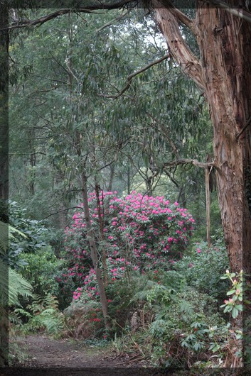 Im Verlauf der Nacht ist ein starker Wind aufgekommen und als wir heute früh aus dem Spaceship schauen, begrüßt uns strömender Regen. Na prima! Bis wir uns aufbruchfertig gemacht haben, hat der Regen etwas nachgelassen. Aufgrund des immer noch stark bewölkten Himmels kürzen wir dennoch einige Punkte aus unserem Programm: Es macht einfach keinen Sinn, bei so einem Wetter den viel gepriesenen Ausblick vom Gipfel des Mount Dandenong auf Melbourne sehen zu wollen. Somit beschränken wir unseren Besuch des Dandenong National Park auf den National Rhododendron Garden, den wir von Healesville aus nach kurzer Fahrt über den Maroondah Highway nach Lilydale und von dort weiter nach Olinda erreichen. Der Rhododendrengarten geht ursprünglich auf eine private Initiative zurück und ist im Verlauf der Zeit auf eine beachtliche Größe erweitert worden. Das regnerische und neblige Wetter ist fast sogar vom Vorteil, denn es verleiht dem Park eine geheimnisvolle und mystische Atmosphäre.