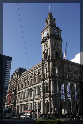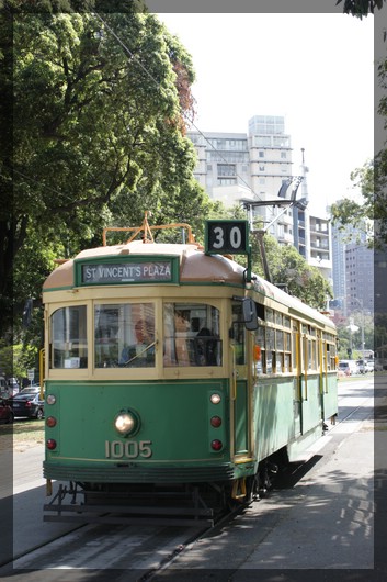 Nur ein paar hundert Meter vom Hotel entfernt, an der Ecke Victoria Street und Nicholson Street, erreichen wir ein Eck der Downtown von Melbourne, oder wie es in Australien heißt, des Central Business Districts. Hier ist auch eine Haltestelle der City Circle Tram, der Trambahn, die eine kostenlose Fahrt quer um den Central Business District ermöglicht. Wir steigen ein und fahren in einer wunderschönen alten Tram vorbei an dem Parlament von Victoria und der Treasury bis zum Federation Square. Dieser relativ zentral gelegene Platz wird von einigen höchst unterschiedlichen Gebäuden gesäumt: Der altehrwürdigen St. Pauls Cathedral, dem modernen Federation Square mit Kunstmuseum und Ausstellungszentrum sowie der geschäftigen Flinders Street Station.