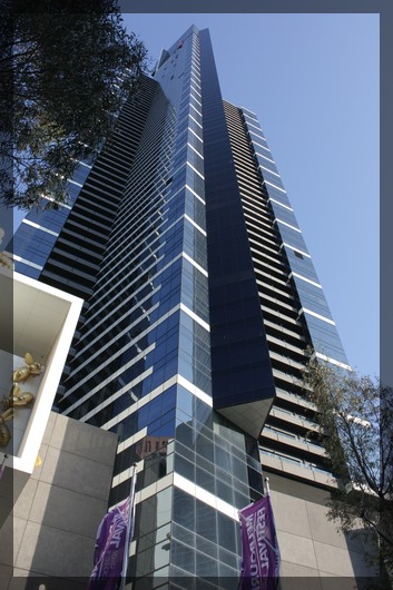 Wir schlendern noch ein wenig durch die Innenstadt und laufen dann entlang der King Street nach Süden. Vorbei am Aquarium überqueren wir den Yarra River. Auf der Südseite des Flusses befindet sich eine schöne Uferpromenade mit vielen Restaurants und Bars. Zudem ein großer Entertainementkomplex mit Kasino. Jetzt, am frühen Abend, ist hier natürlich jede Menge los. Wir laufen ein Stück Richtung Osten, zum Eureka Tower. Dieser 297 Meter hohe Wolkenkratzer ist hinter dem Q1 Tower und dem Sydney Tower das dritthöchste Bauwerk Australiens. Das aus blau glänzendem Glas mit weißen Querstrichen bestehende Äußere des Gebäudes soll an einen Vermessungsstab erinnern. Die Fenster der oberen Stockwerke sind vergoldet, eine Erinnerung an den Goldrausch, der Melbourne und ganz Victoria Mitte des 19. Jahrhunderts einen starken wirtschaftlichen Aufschwung bescherte.
