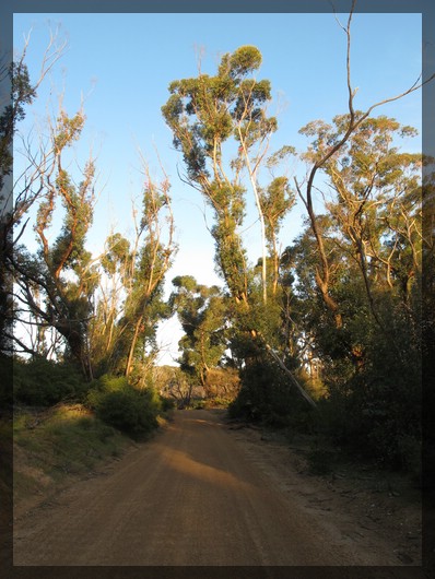 Wir fahren zurück zum Campground und holen dort unser ausgefallenes Frühstück nach. Nun wäre noch eine Wanderung schön. Der Ravine des Casoars Trail im nördlichen Teil des Nationalparks ist gesperrt. Aufgrund des Buschfeuers 2007 auch fast alle Wanderwege in der Nähe des Campgrounds. Und aufgrund der heute Vormittag verloren gegangenen Zeit wollen wir auch nicht mehr allzu weit herumfahren. Was tun? Wir sind pragmatisch und beschließen, ein Stück auf der unasphaltierten West Bay Road abzulaufen. Diese startet direkt hinter dem Visitor Centre und führt im Landesinneren durch Wald an die westlichste Spitze von Kangaroo Island. Abzweigungen führen ans Meer, an die Mündungen von Rocky River, Sandy Creek und Breakneck River. Um diese Abzweigungen zu erreichen, sind wir wohl zu spät unterwegs. Die Straße ist recht schmal und erinnert ein wenig an die Forstwege, über die man beim Bergwandern ja auch einen Teil der Strecke zurücklegt. Alle halbe Stunde kommt ein Auto vorbei und man grüßt sich freundlich.