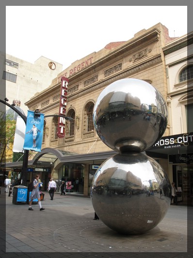 Nach einer kurzen Pause brechen wir auf in die Innenstadt. Unser erstes Ziel ist die Rundle Street Mall. Diese gilt als erste Fußgängerzone Australiens und wurde vom sehr umstrittenen Premierminister Don Dunstan durchgesetzt. Wie unser Reiseführer süffisant schreibt, war dies für viele Bürger das einzig Positive, was Dunstan während seiner Regierung zustande gebracht hat. Die Fußgängerzone gefällt uns sehr gut. Mit den schönen alten Gebäuden links und rechts wirkt sie sehr europäisch, aufgelockert wird das Ganze durch zahlreiche Kunstwerke. Dazu gehören zum Beispiel zwei große aufeinander gestellte Stahlkugeln. Diese sind glatt poliert, so dass sie ein klein wenig an die große Bohne in Chicago erinnern. Etwas danach stoßen wir auf eine Gruppe von Schweinen, die quer durch die Fußgängerzone marschieren. Ein Schwein plündert gerade eine Mülltonne. Die Schweine sind natürlich nicht echt, sondern aus Bronze, genau so wie der äußerst detailliert nachgebildete Inhalt des Mülleimers, an dem sich eines der Viecher gerade gütlich tut.