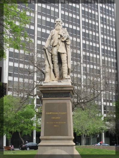 Zu Fuß laufen wir zur Victoria Square, einem großen und schönen zentralen Platz. Hier steht eine riesige Statue der Namensgeberin, aber auch zwei kleinere Statuen, die die Herren Sturt und Stuart darstellen. Hierbei handelt es sich nicht etwa um einen Schreibfehler sondern tatsächlich um zwei unterschiedliche Personen. Beides waren wichtige Pioniere der europäischen Erschließung Australiens: Stuart glückte, von Adelaide aus startend, die erste erfolgreiche Durchquerung des Kontinents von Süden nach Norden - auf seinen Spuren wollen wir in den kommenden Tagen wandeln. Sturt unternahm zwei bedeutende Expeditionen ins Landesinnere von Südaustralien. Nach beiden Forschern sind wichtige Fernstraßen benannt, die zwar beide nicht direkt in Adelaide starten, aber entscheidenden Teil dazu beitragen, von hier aus schnell nach Sydney oder nach Darwin zu gelangen. In der Mitte des Victoria Square finden wir einen schönen Brunnen, in dem jeweils die Statue eines Menschen und eines Vogels jeden der drei Flüsse symbolisieren, die Adelaide mit Wasser versorgen. Weiterhin sind wir beeindruckt, dass auf einer Tafel ausdrücklich darauf hingewiesen wird, dass Teile des Platzes eine wichtige religiöse Bedeutung für die Aborigines haben.