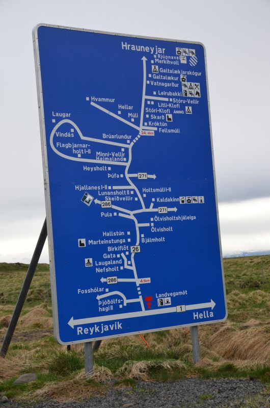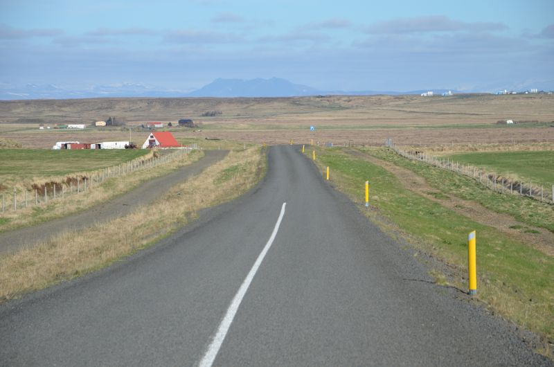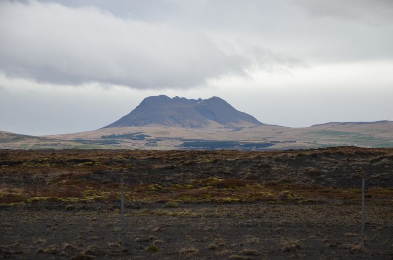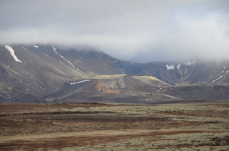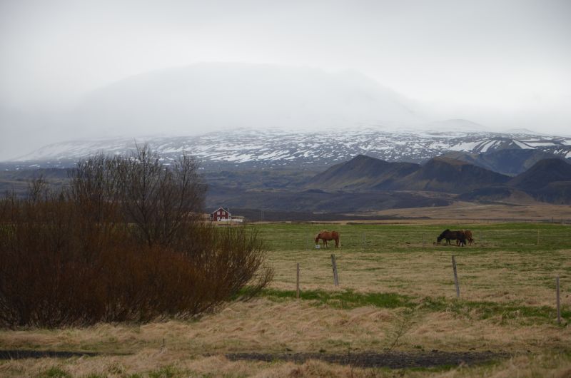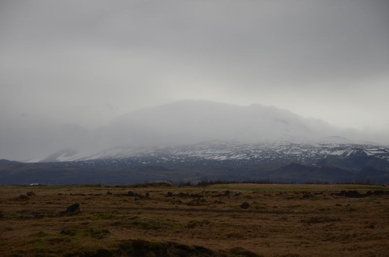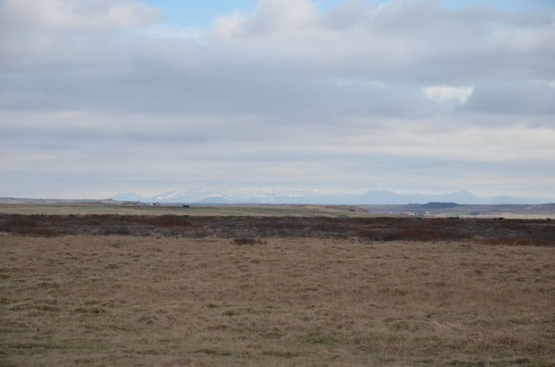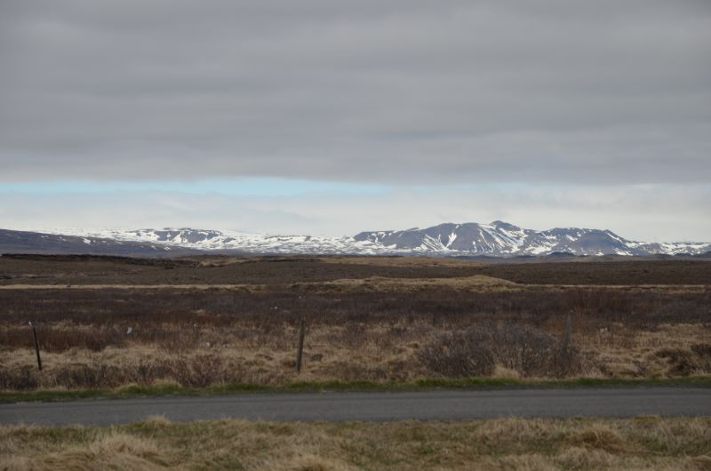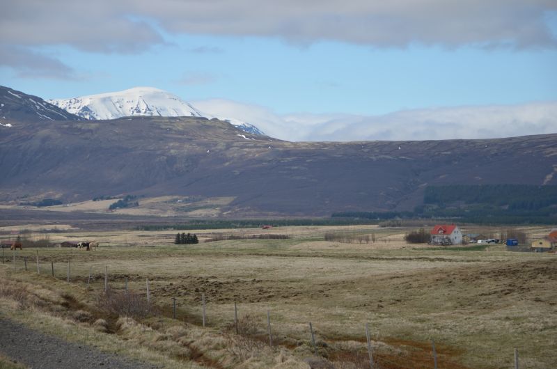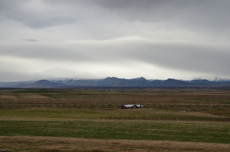Schließlich tun wir es aber doch, denn es klart etwas auf und wird zumindest zeitweise trocken. Von der Ringstraße biegen wir ziemlich schnell auf die Straße ab, die zum Vulkan Hekla führt. Die Hekla zeigt sich nicht in voller Pracht, aber die Fahrt ist ganz nett und zeigt in der Ferne immer wieder schneebedeckte Berggipfel im Sonnenlicht. Auch schön den Übergang von fruchtbarem Farmland zu immer öderem Lavagestein unterwegs zu sehen.
