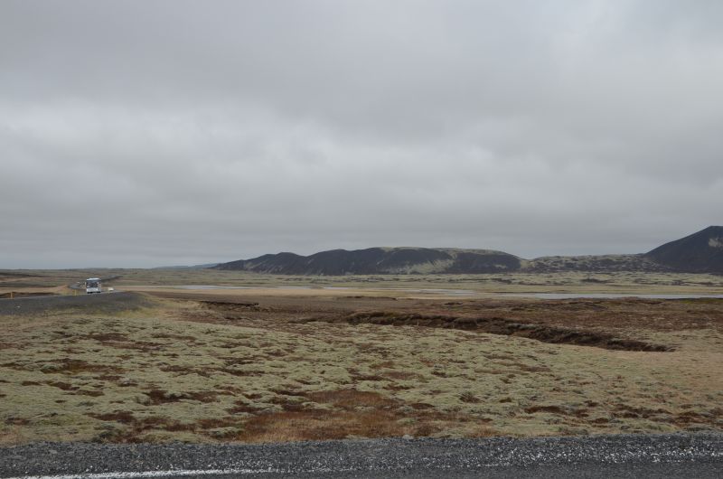 Die weitere Fahrt bis Klaustur – knapp 70 Kilometer – ist überwiegend öde, da es durch völlig unbewohnte Landstriche geht. Zuerst 50 Kilometer durch eine Sandwüste, die zum Glück weitestgehend bepflanzt ist, so kommen wir um ein sandgestrahltes Auto herum. Danach geht es durch das Lavafeld Eldhraun, das dafür bekannt ist, dass die Lava überwiegend mit Moos bewachsen ist. Das sieht schon wieder netter aus und der Wind lässt auch ein wenig nach und im Hintergrund kann man die ersten Berge und Gletscher des Vatnajökull Nationalparks erahnen.