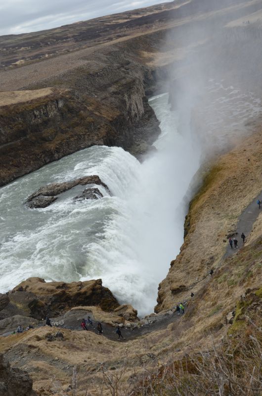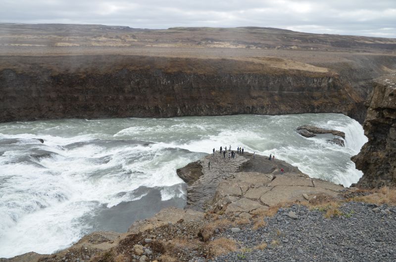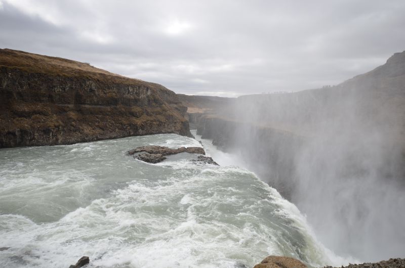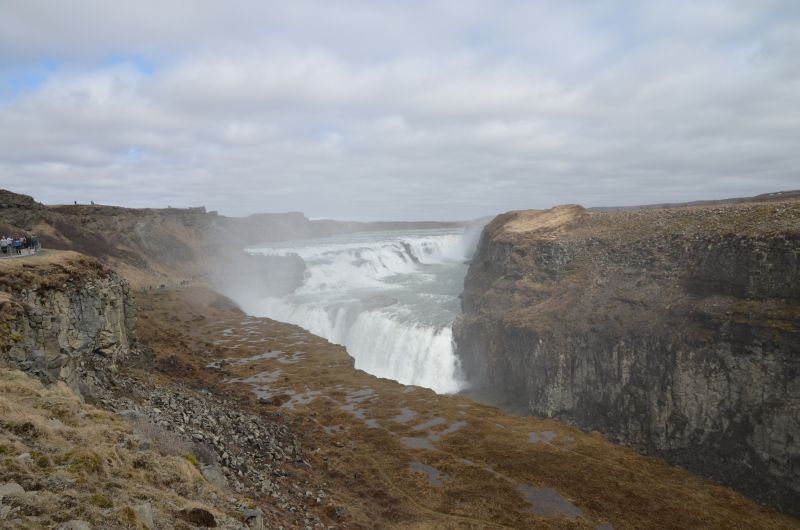 Nach ein paar Ausbrüchen haben wir genug und vor allem Simon langweilt das Warten vor einem leise köchelnden Wasserloch. Außerdem müffelt es dezent. Also zurück ins Auto und Weiterfahrt zum Gulfoss, dem bekanntesten Wasserfall Islands bei dem das Wasser laut donnernd über zwei Stufen und insgesamt 31 Meter in eine enge Schlucht stürzt. Simon ist vom Kinderwagen wenig angetan, so gehen wir eben beide abwechselnd zu den Aussichtspunkten. Ganz am Ende kommen sogar erste Sonnenstrahlen durch.