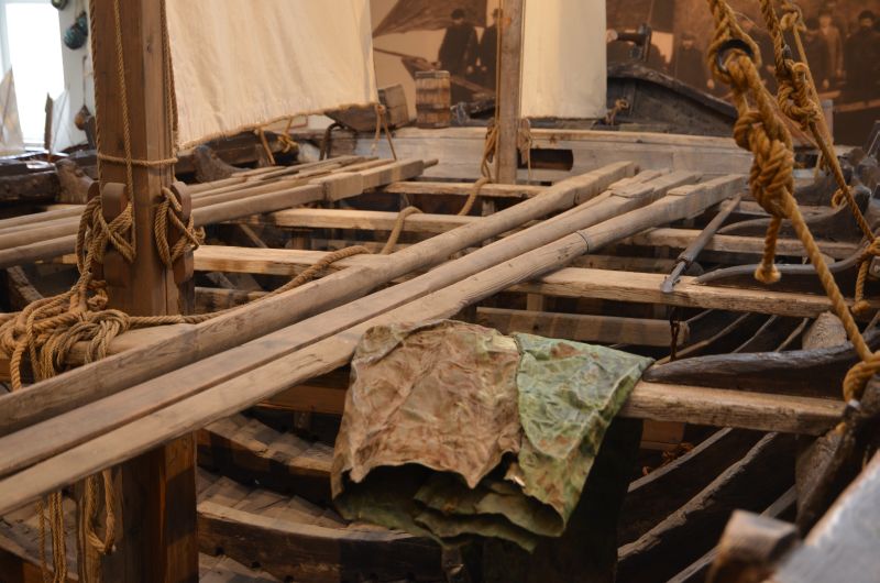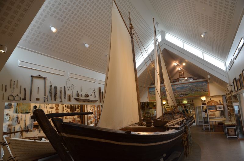 Danach beratschlagen wir, was mit dem angefangenen Tag noch zu tun ist. In Skógar, dem kleinen Örtchen am Skógafoss gibt es noch das Skógar Museum, sehr bekannt und eine Mischung aus Heimat-, Freilicht- und Technikmuseum, zusammengetragen von einem leidenschaftlichen Sammler. Wir nutzen das schlechte Wetter und schauen uns zumindest die innen liegenden Teile an, die viele – fast zuviele – Gegenstände aus dem Island der früheren Jahre zeigen. Herzstück der Sammlung ist dabei ein großes Fischerboot aus dem 19. Jahrhundert. Da die Tickets auch morgen noch gelten verzichten wir auf das Außengelände und begeben uns zurück im Hotel. Im zugehörigen Restaurant erfreuen wir uns an Lamm und Seesaibling (Arctic Char – die hiesige Fischspezialität), beobachten wie draußen zwei Unentwegte ihr Zelt aufbauen und hoffen, dass das Wetter morgen besser wird und die Straßen wieder offen sind. Sonst müssen wir eben umplanen.