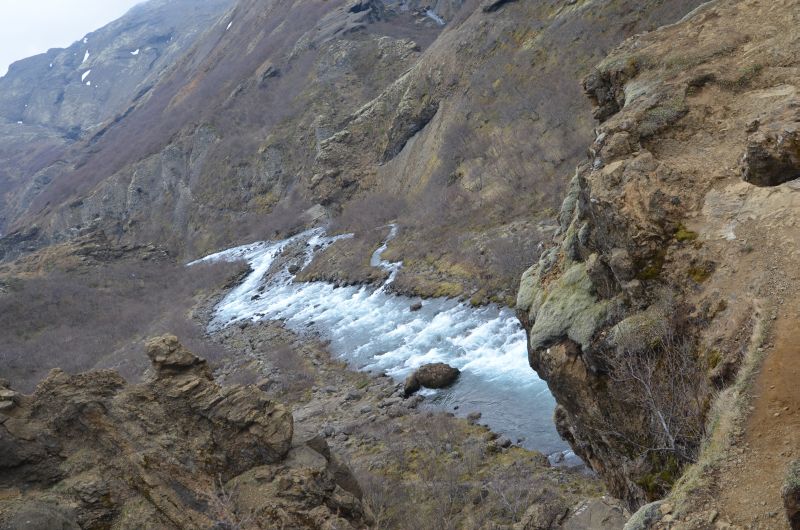 Wir packen Simon in unsere Trage und laufen knapp zwei Stunden durch den Park, dabei fällt auf, dass an englischen Informationsschildern doch sehr gespart wird. Man muss schon wissen wohin man will. Beginnend mit einem künstlichen Wasserfall um die Ebene zu bewässern – das älteste Bauwerk Islands – geht es durch die Allmanagjá Schluicht zu einem hochgelegenen Aussichtspunkt.
