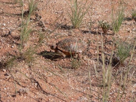 Das erste Wasserloch ist das Middelpos Waterhole. Wir sind auf weiter Flur alleine, abgesehen von dem Wild, dass wir hier antreffen: Oryx, Kuhantilopen, Gnus, Springböcke, Strauße und eine Schildkröte. Damit hatten wir nicht gerechnet, allerdings sieht man sie meist nur in einiger Entfernung.