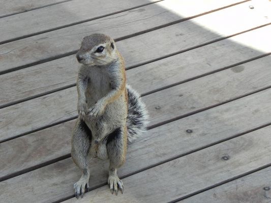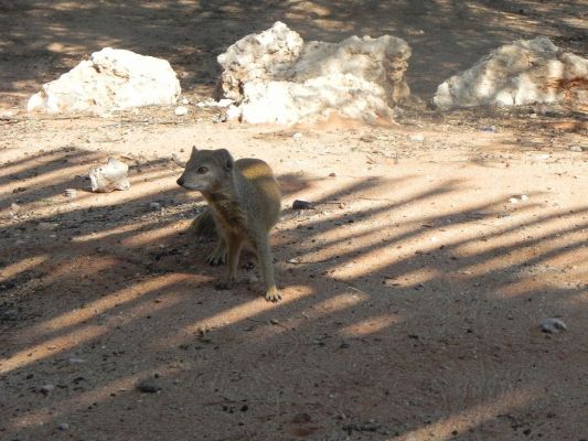 Es ist windig, aber dennoch frühstücken wir auf der Terrasse. Nervend sind jedoch die quietschenden Kratzgeräusche, die durch den Wind verursacht werden: er lässt die Äste des Kameldornbaumes auf dem Küchendach lang kratzen. Entschädigt werden wir aber durch die niedlichen Erdhörnchen und Fuchsmangusten, denen wir stundenlang beim Spielen, Raufen etc zusehen können.