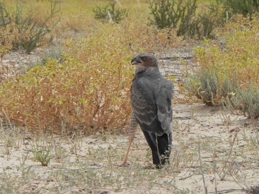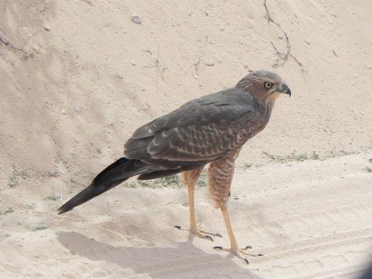 Wir fahren noch bis zum Veertiende Boorgat, das weitere Springböcke, Gnus, Gemsböcke, und Sekretäre für uns bereit hält sowie die ersten Kuhantilopen des heutigen Tages. Als wir umkehren, schließen wir Wetten ab, ob der Tankwagen noch im Sand feststeckt. Kurze Zeit später kommt er uns entgegen, prima, dann geht es also ohne Hindernisse –aber nicht ohne längeren Stopp - nach Mata Mata. Schuld ist dieser Mäusebussard, der so herzzerreißende Töne von sich gibt. Ob er wohl Hunger hat? Aber hier im Sand wird er wohl nichts finden und von uns gibt es auch nichts, auch wenn es schwer fällt, hart zu bleiben.