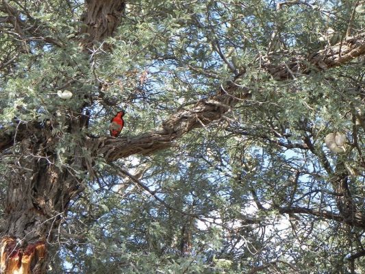Glanzstare und die schönen bunten Gabelracken fliegen umher und einen Milchuhu (der gleiche von gestern?) entdecken wir auch.