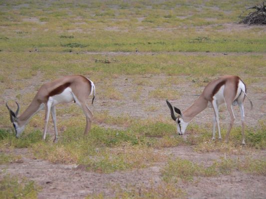 Ausgeruht fahren wir gegen 15:30 h erneut los. Die üblichen Tiere wie Gnus, Schakale, Strauße, Spieß- und Springböcke laufen uns über den Weg.