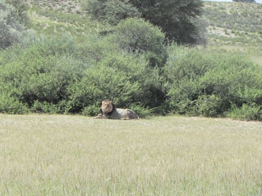 Wir sitzen wieder auf unserer Veranda, als die anderen Besucher – eine Familie mit ihrer erwachsenen Tochter und Schwiegersohn aus Kapstadt- plötzlich auf „unsere“ Seite laufen. Was ist denn los? Ein Leo streicht in einiger Entfernung durch das hohe Gras. Kurz können wir etwas ausmachen, aber dann verlieren wir ihn aus den Augen. Kurze Zeit später taucht er am Wasserloch auf, wo wir ihn dann mit dem Fernglas gut beobachten können. Großen Durst scheint er nicht zu haben, denn er verzieht sich bald wieder. Wir sind beschwingt, gerade hier hatten wir nicht mit einer Sichtung gerechnet.