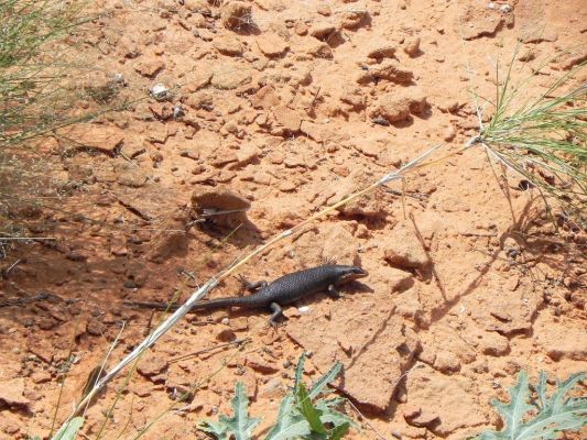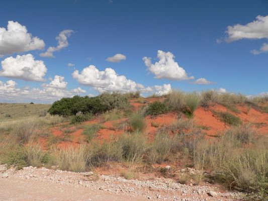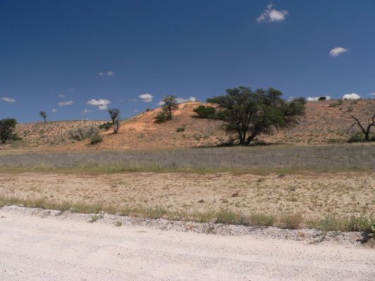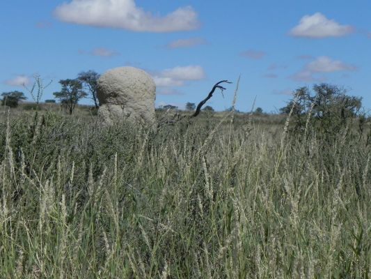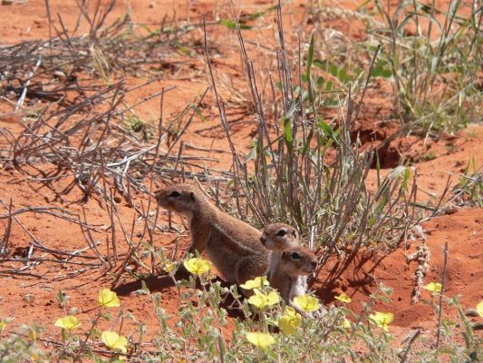 Entlang der nördlichen Dünenroad  fallen uns neben Spießböcken und Kuhantilopen vor allem Mäuse, Fuchsmangusten, Erdhörnchen sowie Termitenbauten ins Auge.