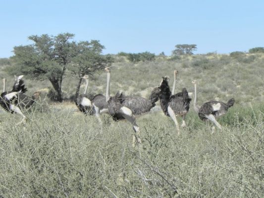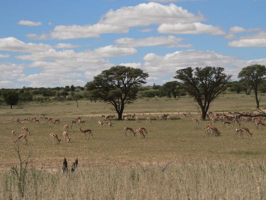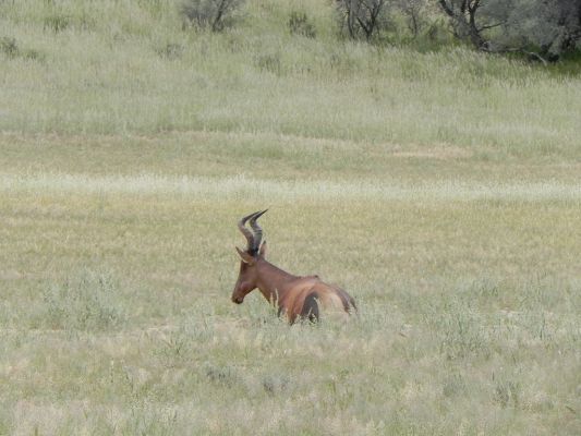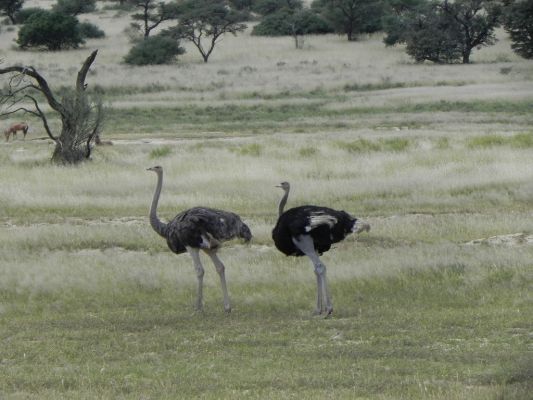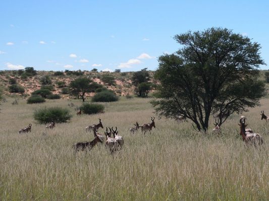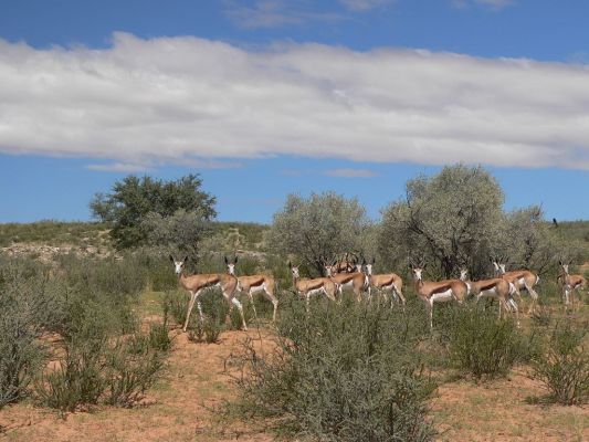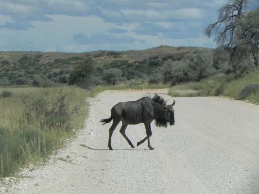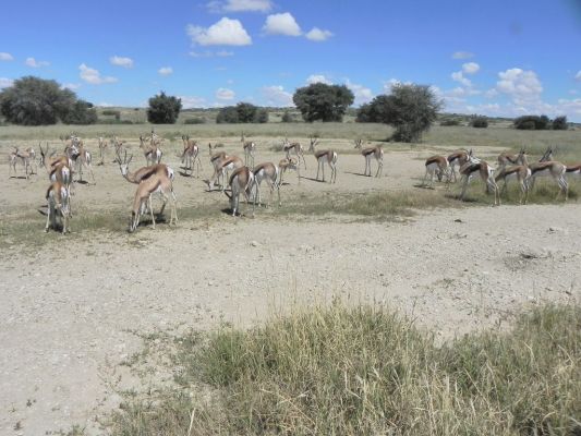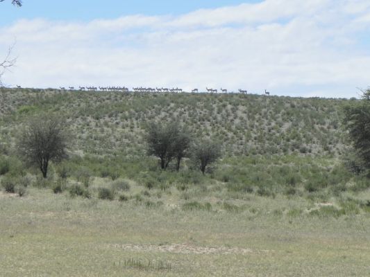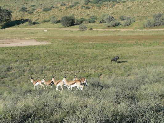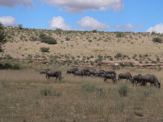 Auf dem Weg nach Twee Rivieren begegnen wir den üblichen Kalaharibewohnern: Springböcke, Oryxantilopen, viele Gnus, Strauße, Erdhörnchen und Kuhantilopen.