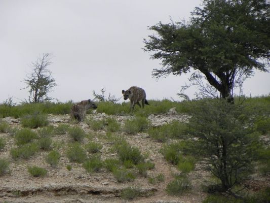 Am Viewpoint Urikaruus ist nichts los, am Wasserloch Kamqua nur ein Sekretär. Obwohl, was regt sich auf der anderen Seite unter dem Baum? Zwei Tüpfelhyänen!