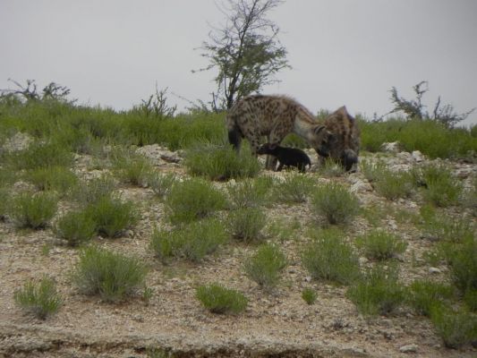 Beim genaueren Hinsehen erkennen wir nach und nach insgesamt fünf erwachsene Hyänen, das I-Tüpfelchen ist aber das Jungtier. Es hat noch nicht die typische Fellzeichnung sondern ist ganz schwarz. Das Muttertier putzt es und passt auf, dass das Kleine sich nicht zu weit weg vom Bau entfernt.
