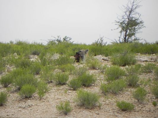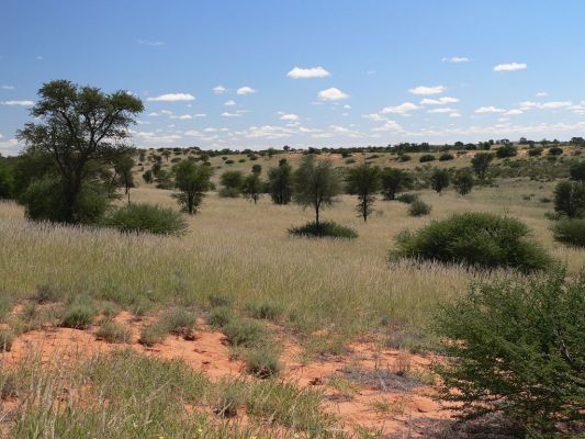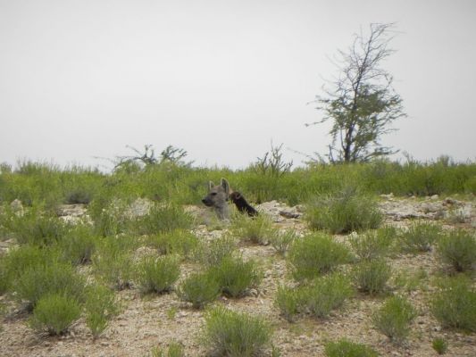 Christian checkt die Umgebung mit dem Fernglas und irgendetwas bewegt sich da, aber was? Er lässt mich durchschauen, aber es ist schwer zu beurteilen, ist es der Schwanz eines Tieres, was sich da bewegt oder sind es nur die Grasbüschel, die sich im Wind wiegen. Christian ist fast überzeugt, dass es ein Honigdachs ist. Wir beobachten die Stelle weiter, aber bekommen leider keine Klarheit und fahren dann zurück. Uns fällt auf, dass sich hier keine Tausendfüßler sehen lassen, waren sie in Nossob nur aufgrund des Regens so leicht zu entdecken?