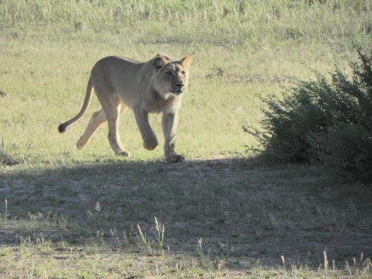 Die Nacht verlief ohne besondere Vorkommnisse. Da wir heute das Camp wechseln, packen wir unsere Sachen zusammen, bevor es auf Pirsch geht. Es ist kurz nach 07:00 h, als wir Nossob verlassen. Wir fahren wieder den Umweg zum Wasserloch Marie se gat, aber außer Tauben tut sich dort nichts. Es geht an Kuhantilopen und Oryx vorbei und schon haben wir das heutige Highlight vor uns: eine Löwin.