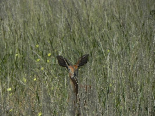 Kurz nach dem wir weiterfahren, sehe ich im Augenwinkel eine Silhouette und bitte Christian anzuhalten. Ich habe mich nicht getäuscht, es ist ein Gepard. Leider verschwindet er zu schnell im hohen Gras. Schade, wir hätten ihn gern ein Weilchen beobachtet, aber so eine Sichtung gibt immer Auftrieb für den restlichen Tag.   :dance: