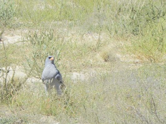 Am Abzweig zur Dune Road South ist die Piste nach Twee Rivieren immer noch nur für 4x4-Fahrzeuge freigegeben. Auf dieser Strecke sehen wir kaum Tiere, vielleicht liegt es an der Mittagszeit? Nur ein Weißbürzelsinghabicht gewährt uns ein kurzes Fotoshooting.