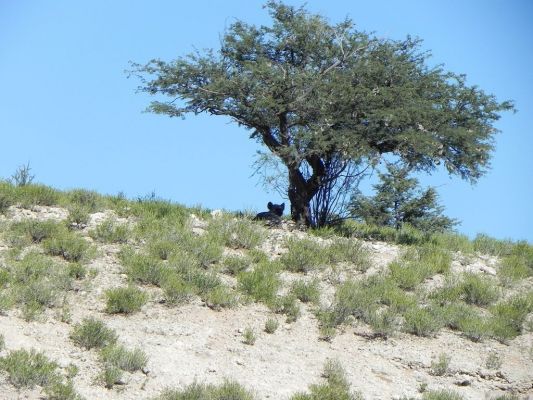 Das Veertiende Wasserloch ist verweist, aber etwas weiter von uns entfernt sind zwei Schakale, ein weiterer nagt am Oryxgerippe.