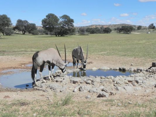 Auch am Dalkeith Wasserloch ist Leben: Oryxe sind beim Trinken, etwas zurückgesetzt grasen Gnus und Springböcke.