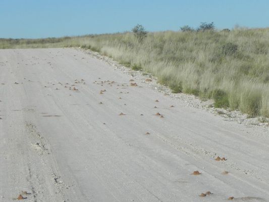 Ein paar Weißflügeltrappen begegnen uns auch, ansonsten ist „tote Hose“. Wie wir später vom älteren Pärchen, die nach uns Bitterpan verlassen haben, erfahren, hatten wir das falsche Timing: sie sahen auf der Strecke vier Löwen und einen Leo bei Vaalpan.
