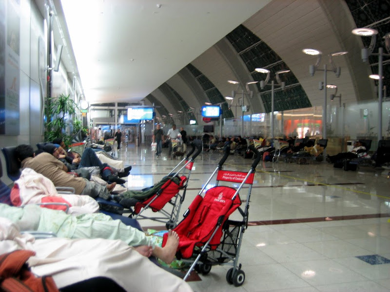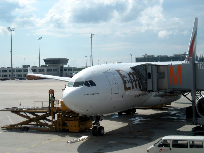 Wieder zurück am Flughafen checkten wir endlich bei Emirates ein (diesmal hatte der Koffer nur 17kg....) und warteten wieder mal bis das Boarding begann. Der Flug ansich war unspektakulär und das Boardentertainment war naja. Am Infoscreen sahen wir noch, daß wir einen Bogen um den Irak flogen, aber dann waren wir auch schon in Dubai gelandet. Kurz vorm Landen (ca 50m über dem Boden), sackten wir noch in ein verhältnismässig großes Luftloch, was einige kurze Aufschreie im Flugzeug nach sich zog.