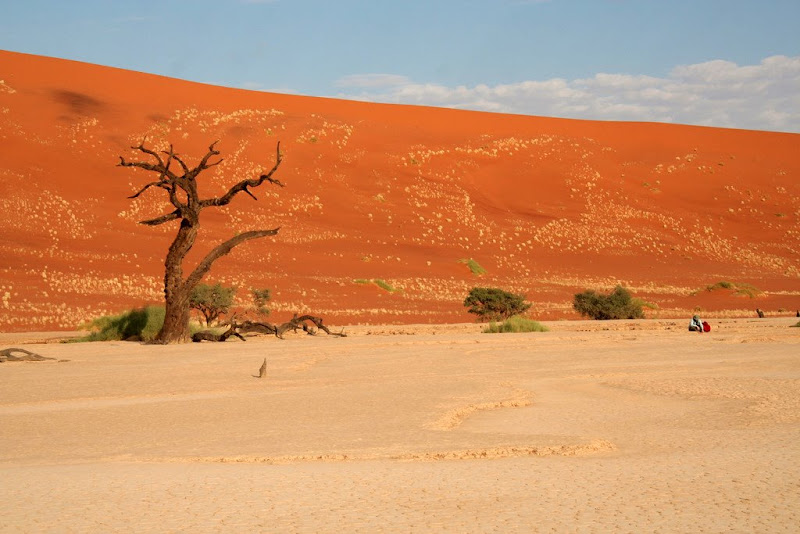 Düne 45 war nach 45 km passiert und weitere 20km später endete die Teerstraße. (Diese wurde gebaut, da der feine Staub der vielen Touristenautos die Vegetation fast zum Absterben gebracht hätte.) Die letzten 4 km ging es durch tiefen Sand, den Conny in ihrer ersten 4WD-Fahrt mit Bravur gemeistert hat. Beim Deadvlei blieben wir stehen und versuchten die Wanderung in Angriff zu nehmen. Leider war der Weg jedoch nur sehr spärlich gekennzeichnet und wir wollten uns so spät am Nachmittag nicht verlaufen. So erkundeten wir die nähere Umgebung und nach ca 45 min fuhren wir zurück zur Düne 45 wo wir ein Stück raufwanderten. Als Vergleich: Bergsteigen ist 100x einfacher, als so eine Düne rauf.......