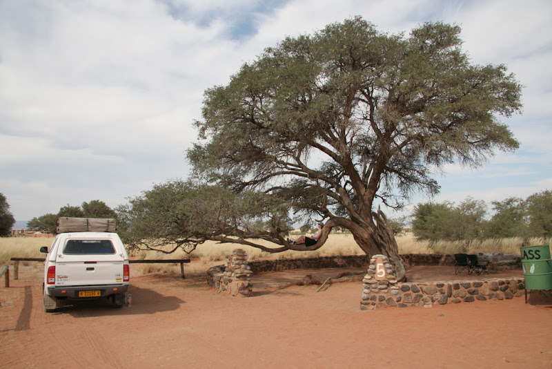 Das Brennholz ist so hart, daß man nur mit Grillanzündern weiterkommt. Diese lagen aber gut verpackt im Sparmarkt in Windhoek..... Und die nächste Tankstelle lag 200km weiter südlich. So brutzelten wir unser Fleisch über den Gaskocher und dazu gab es Kartoffeln. Das alles aber natürlcih nur mit eisgekühltem Bier.... wobei..... leider nicht ganz. Beim Putzen des Kühlschrankes in Windhoek hat der männliche Mitfahrer (sprich ich), vergessen das Stromkabel wieder anzuschliessen. 1 Tag bei 30-35 Grad und keine Kühlleistung. Zum Glück hatten wir gekühltes Bier gekauft, welche ein wenig als Kühlakkus fungierten, dies hat uns vor Schlimmerem bewahrt. Trotzdem liessen wir den Motor für gut eine Stunde laufen, damit sich der Kühlschrank ein wenig abkühlte.