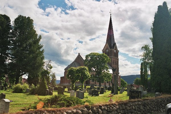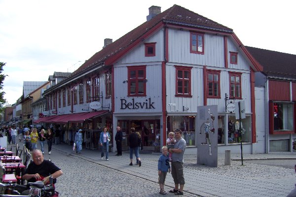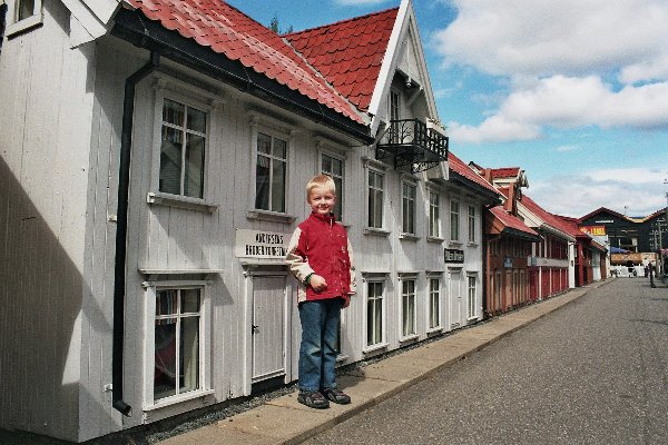 Wir fuhren ins Zentrum, fanden nach einigem Hin und Her einen Parkplatz in der Nähe der Stadtkirche und konnten mit Vincents und unseren letzten Münzen gerade so einen Parkschein bis 16 Uhr lösen. Das ließ uns zwar nicht üppig viel Zeit, aber für einen kleinen Stadtbummel musste es einfach reichen. Wir schlenderten die Storegata entlang, als Vincent auf einmal seinen Spielfreund Karl auf der Straße entdeckte. So hielten wir denn noch ein kurzes Schwätzchen über die Erlebnisse der letzten Tage. Karl und seine Eltern waren tatsächlich den gesamten Weg durch das Flåmtal mit den Fahrrädern gefahren, hatten im ersten, steilen Abschnitt aber schon ziemlich zu kämpfen gehabt. Anschließend waren sie noch bis Alesund und anschließend über den Trollstigen, die E136 und die E6 hierher gefahren. Ein gewaltiges Pensum für die vergangenen vier Tage, wie wir fanden. Nach einer Weile wurde Lisa auf einmal unruhig und wir bemerkten, dass es sehr streng aus ihrer Windel duftete. Also verabschiedeten wir uns und suchten ein nettes Café, wo Lisa auf der Toilette eine frische Windel bekam. Wir nutzen die Gelegenheit für zwei doppelte Espresso, während sich die Kinder in der Spielecke mit Legosteinen beschäftigten. Auf dem Rückweg zum Wohnmobil kauften wir rasch noch ein paar Sachen zum Abendbrot im KIWI-Markt, wobei wir schon wieder arg auf die Uhr schauen mussten. Um 16:20 Uhr waren wir schließlich zurück und hatten wieder Glück, es hatte sich niemand für unsere überzogene Parkzeit interessiert. Während Doreen die Einkäufe verstaute, machte Andreas rasch noch ein paar Fotos von der Kirche, dann waren wir abfahrbereit.