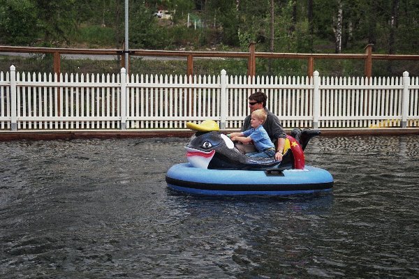 Unsere Kinder hatten eine Menge Spaß in den kleinen Häusern. Lisa fühlte sich sofort in der Puppenküche wohl und spielte dann im Haus nebenan mit riesigen Legosteinen. Vincent fuhr einige Runden mit einem Elektro-Rennauto und danach sogar mit Lisa zusammen in einem kleinen Taxi. Anschließend ging es zum Herumtollen auf das Hopsefeld und Vincent und Andreas fuhren mit dem Wasserscooter.