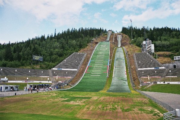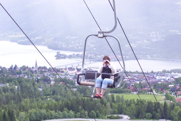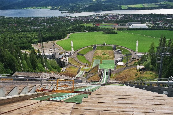 Mittlerweile war es bereits 16:30 Uhr, daher ließen wir die umfangreiche Sammlung von Baumaschinen aus mehreren Epochen auf dem Außengelände unbeachtet und fuhren weiter nach Lillehammer. Hier führte uns der erste Weg in den Olympiapark, wo wir gegen 17 Uhr ankamen. Besonders sehenswert sind natürlich die beiden Ski-Sprungschanzen, die hier an den Berg gebaut wurden. Mit einem Sessellift kann man nach oben fahren und den Blick vom Schanzenturm genießen. Leider war dieser Lift absolut nichts für Kleinkinder, also gab es keine Chance, mit Lisa hinauf zu fahren. Daher entschied sich Andreas, mit Lisa in der Kraxe die Stufen hinauf zu steigen. Da Vincent ein wenig Angst vor der Fahrt im offenen Lift hatte, lief er ebenfalls mit die Stufen hinauf, während Doreen die 45 NOK für den Sessellift bezahlte und gemütlich nach oben fuhr. Der Blick von oben war einfach toll und entschädigte auch für die schweißtreibende Treppenorgie.