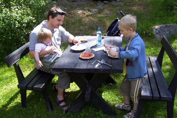Wir bestellten zwei doppelte Espresso, eine 7Up für Vincent und einen Kjæfjordkake, von dem wir alle mal probierten. Leider verdüsterte sich der Himmel zusehends und wir hatten nicht mehr die Ruhe, länger sitzen zu bleiben.
