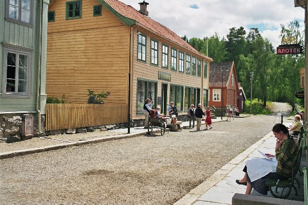 Um 11 Uhr rissen wir sie dann aber aus dem Spiel heraus und verließen den Campingplatz. Zunächst führte uns der Weg nach Maihaugen, einem großen Freilichtmuseum mit einer Sammlung alter Häuser und Gebäuden von Bauernhöfen aus dem Gudbrandstal. Am Parkplatz wurde man sogleich zur Kasse gebeten: 12 NOK pro Stunde bzw. 40 NOK für ein Tagesticket. Wir warfen Münzen für etwa 1,5 Stunden ein, viel mehr Zeit wollten wir hier nicht verbringen, schließlich sollte es heute noch bis nach Oslo gehen. Kaum waren wir auf dem Gelände, bemerkten wir, dass sich sowohl Anzahl der Bilder in der Spiegelreflexkamera als auch der Speicherplatz in der Digitalkamera dem Ende zu neigten. Also lief Andreas noch mal zurück zum Wohnmobil, um einen Ersatzfilm (den letzten!) sowie die zweite Speicherkarte zu holen. Damit war die erste Viertelstunde unserer Parkzeit bereits verstrichen. Um 12 Uhr starteten wir endlich den Rundgang über das sehr weitläufige, liebevoll angelegte Gelände. In vielen Gebäuden gab es Erläuterungen oder Vorführungen von historisch gekleideten Menschen und schon bald wurde uns klar, dass wir die Dimensionen dieser Anlage völlig unterschätzt hatten.