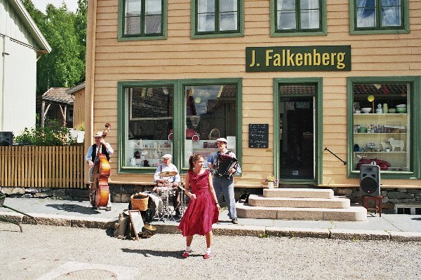 Das Angebot war jedoch ziemlich spärlich, die Preise dafür umso gesalzener. Wir kauften zwei Plinsen, eine Waffel mit Marmelade, ein Rømmegrøt mit Zucker und Zimt sowie ein Wasser, alles zusammen für 149 NOK. Immerhin wurden die Kinder satt und wir bekamen auch von allem eine Kostprobe. Anschließend leisteten wir uns noch je ein Eis für Vincent, Doreen und Andreas und setzten dann unseren Rundgang fort. Die Parkzeit war inzwischen längst abgelaufen und Andreas wurde entsprechend unruhig. Daher handelten wir die Häuser im moderneren Teil Maihaugens etwas kürzer ab, blieben aber dann doch bei einer Live-Show mit Musik und Tanz vor den Stadthäusern des 20. Jahrhunderts eine ganze Weile stehen. Die Stimmung war ganz einfach zu mitreißend, als dass wir daran einfach hätten vorbeigehen können…