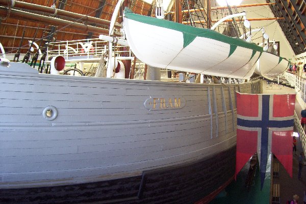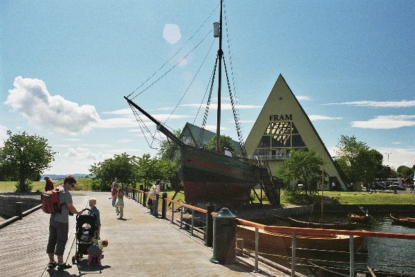Zunächst mussten wir in der Nähe des Rathauses aber erst mal wieder an einen Bankautomaten, um etwas Bargeld zu besorgen. Dann bummelten wir zur Anlegestelle der Fähre nach Bygdøy, wo wir auch gar nicht lange warten mussten. Beim Einsteigen wurde unser voll bepackter Buggy argwöhnisch betrachtet, dann bekamen wir die Order, diesen zusammenzuklappen, da mit dieser Fähre eigentlich keine Kinderwagen transportiert würden. Alternativ könnten wir auf die nächste, größere Fähre warten. Eigentlich fanden wir die ganze Aktion ziemlich sinnlos, die Fähre war halbleer und niemand störte sich an dem Buggy. Da wir aber nicht wieder aussteigen und warten wollten, fügten wir uns schweigend, luden Foto- und Videoausrüstung, die Wasserflasche und Regenjacken aus, klappten Lisas Buggy zusammen und genossen dann die Überfahrt. Erster Anlaufpunkt auf der Halbinsel Bygdøy war für uns das Fråm-Museum.