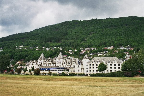 Nach dem Frühstück packte Doreen alles reisefertig zusammen, Andreas leerte den Fäkaltank und gegen 11 Uhr waren wir abfahrbereit. Schnell wurde noch der Abwassertank geleert und Frischwasser nachgetankt, dann ging die Fahrt los über die E16 nach Voss. Die Straße führte zunächst am Fjord entlang und wir passierten unglaublich viele Tunnel; irgendwann -schon längst im zweistelligen Bereich- hörten wir zu zählen auf. Nur Vincent zählte bei jedem Tunnel die Sekunden vom Anfang bis zum Ende. Gegen 12:30 Uhr kamen wir in Voss an. Am Ortseingang grüßte uns der mondäne Bau von Fleischer´s Hotel am Fuß des Berges, kurz dahinter befand sich die Talstation der Seilbahn zum Hangurfjellet.